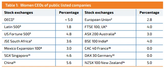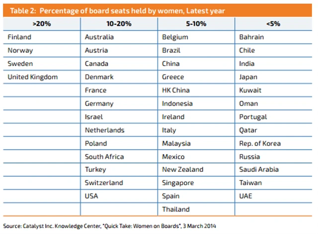 Podobně nepříznivý trend je patrný při pohledu na genderové rozložení v představenstvech firem na celém světě. Aktuální studie neziskové agentury Catalyst týkající se ženských práv odhalila, že ve světově nejrozvinutějších zemích jsou ženy stále nedostatečně zastoupeny v představenstvech velkých korporací. Například v USA, které si na genderové rovnoprávnosti zakládají, je to jen méně než 20 % pozic. Šéfka Yahoo! Například Marissa Mayer je tak vlastně velkou výjimkou.