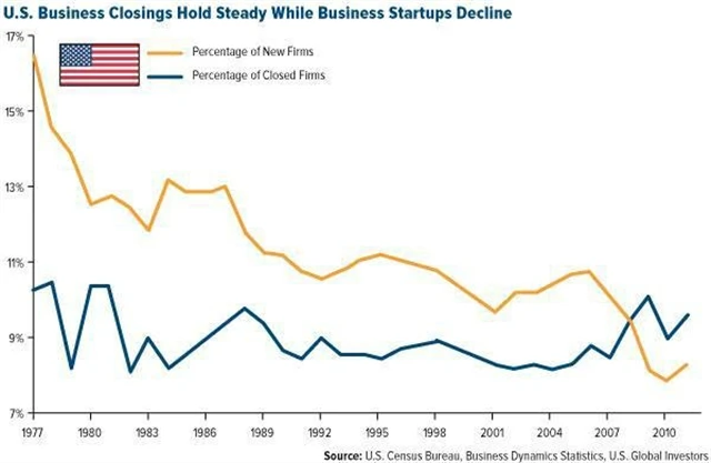 Tempo vzniku nových firem v USA klesá již třicet let. Od finanční krize z roku 2008 navíc ve Spojených státech v procentuálním vyjádření každý rok více firem skončí, než vznikne, na čemž zatím nic nedokázalo změnit ani současné pokračující silné oživování americké ekonomiky.