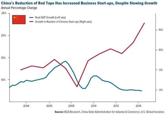 V Číně se naproti tomu tempo vzniku nových firem nachází v silně růstovém trendu a aktuálně dosahuje více než 15 %. A to i přesto, že meziroční růst čínského HDP od roku 2007 klesá a aktuálně se pohybuje jen mírně nad sedmi procenty.