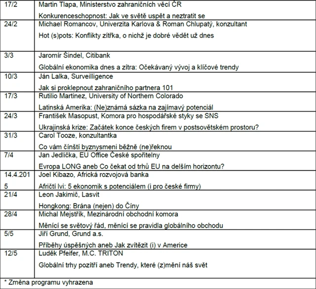 Každé úterý od 18.00 v učebně RB212 v Rajské budově Vysoké školy ekonomické na Žižkově nabídne své zkušenosti a pohled na problematiku spjatou s globálním obchodem a exportem přední odborník z Česka či ze světa. Cyklus odstartuje 17. února 2015 náměstek ministra zahraničních věcí a spoluautor Strategie konkurenceschopnosti Martin Tlapa přednáškou na téma „Konkurenceschopnost aneb Jak se ve světě neztratit“, v níž se zaměří na výhody i nevýhody českých firem na světových trzích a na různé aspekty obchodní diplomacie.