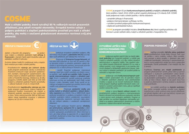 Program COSME, který je implementován a financován Evropskou komisí přímo z rozpočtu EU, má v gesci Odbor inovačního podnikání a investic Ministerstva průmyslu a obchodu. Jeho prostřednictvím již ostatně byly vyhlášeny dvě výzvy. Ty jsou určeny finančním institucím a fondům, které mohou poskytovat půjčky malým a středním podnikům a záručním institucím a fondům, které jsou zřízeny za účelem poskytování rizikového kapitálu malým a středním podnikům. Vybraní zprostředkovatelé budou díky finančním zárukám z programu spravovat a poskytovat finanční nástroje včetně rizikového kapitálu na podporu růstu firem, a to především v inovativní a výzkumné oblasti a s přeshraničním dopadem.