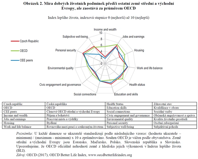Současný stav českého trhu práce je takový, že všichni, kdo o to stojí, již možnost strávit rozumné množství času v práci mají (důležitou výjimkou jsou stále ještě početní zájemci o částečné úvazky). Problém je spíše v tom (a OECD to férově přiznává), že česká pracovní síla si za to stále ještě nevydělává odpovídající peníze. Česko si tak v porovnání s průměrem OECD vede nejhůře právě v oblasti příjmů a bohatství (mezera mezi zelenou a červenou čárou v horní části grafu). Český trh práce již naštěstí problém nízkých mezd postupně řeší formou růstu mezd zřetelně překonávajícího míru inflace.