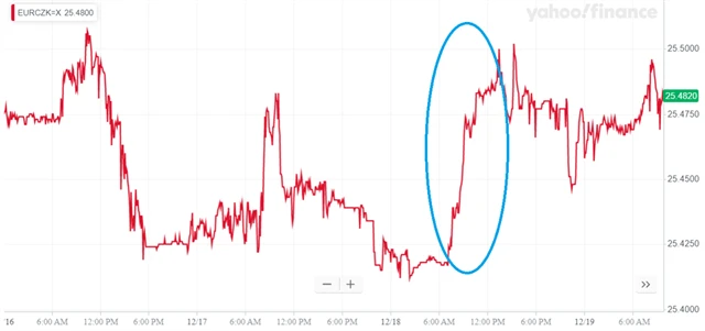 Česká národní banka v prosinci ponechala měnovou politiku beze změny, což nebylo žádné překvapení. I tak se ve středu na grafu kurzu EUR/CZK dal vysledovat výrazný pohyb, ovšem směrem ke slabší české měně. Možné důvody vysvětluje ekonom Michal Skořepa z České spořitelny.