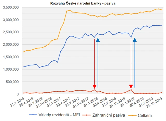 Loni na tomto efektu nejspíše vydělaly některé zahraniční centrální banky, když koruny na pár týdnů od klientů odkoupily a uložily do ČNB, aniž by samozřejmě musely platit zmíněné poplatky/příspěvky. V grafu to vidíme jako jednoměsíční pokles vkladů českých bank v ČNB (modrá čára) a protichůdný nárůst "zahraničních pasiv" ČNB (červená čára) v prosinci 2018 a hlavně v prosinci 2019, načež hned v lednu následovala korekce.