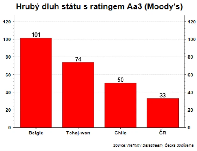 Když se pak podíváme na země, které mají stejný rating jako ČCR, zjistíme, že dluh máme opravdu nejnižší. Belgie je agenturou Moody's hodnocena jako stejně riziková země, byť s dluhem třikrát vyšším. Výše dluhu tedy ne vždy brání solidnímu ratingu. V případě Belgie je to o to zajímavější, že je v žebříčku Doing Business až za Českem (ČR je 35., Belgie 45.). Ve skupině zemí se stejným ratingem by inspirací mohl být Tchaj-wan na 13. místě.