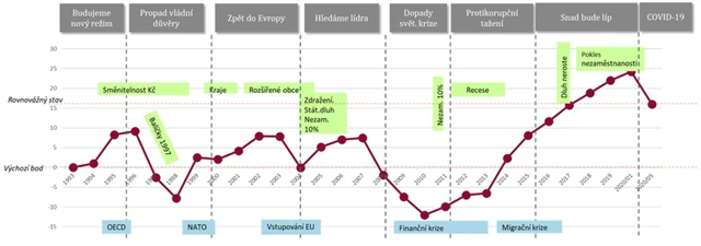 Důvěra v relativně blízkou budoucnost je hodně důležitá. I v lednu, na vrcholu konjunktury, bylo 17 % těch, jejichž vyhlídky byly spíše negativní. Nyní je jich 30 %. Jde samozřejmě o významný nárůst, ale při pohledu na posledních 30 let vývoje ČR jde spíše o návrat k běžným hodnotám.
