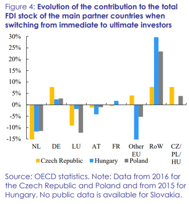 Vedle jiných zajímavých údajů nabídla studie i graf, který v rámci tří středoevropských zemí srovnává složení přišlých investic podle země počátečního investora (pokud tedy například občan USA poslal do Česka přímou investici tak, že ji provedla firma sídlící v Irsku, je investice v grafu zařazena do investic z USA, nikoli z Irska).