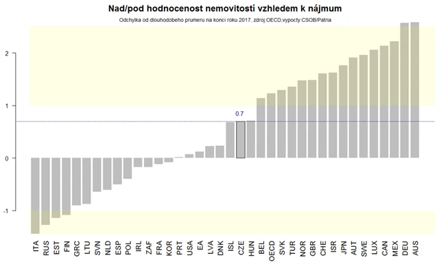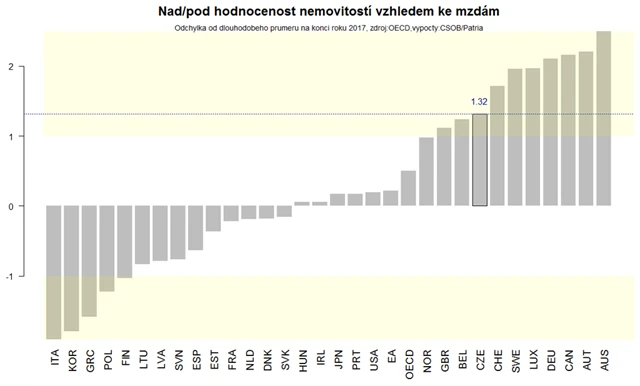 Vzhledem k průměrným příjmům domácností jsou české rezidenční reality nyní nadhodnocené. Poměr cen nemovitostí ke mzdám byl na konci roku 2017 vyšší než dlouhodobý průměr, a to konkrétně o 1,3násobek směrodatné odchylky. To je více než ve většině zemí EU i OECD. "Za výrazné zhoršení cenové dostupnosti bydlení pro domácnosti přitom považujeme nárůst poměru nad dlouhodobý průměr o více než jednu směrodatnou odchylku," říká Jan Bureš, ekonom z ČSOB.