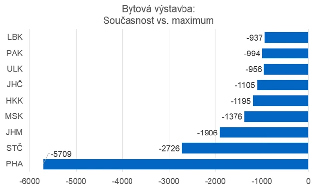 Přírůstky domácností sílily především v posledních pěti letech (+232 tisíc), kdy bylo celkově poskytnuto přes 350 tisíc hypoték na koupi nemovitosti. Nových bytů přitom za posledních pět let bylo dokončeno jen 40 tisíc. Výstavba zaostává oproti maximálním úrovním zejména v Praze, středních Čechách a na jižní Moravě.