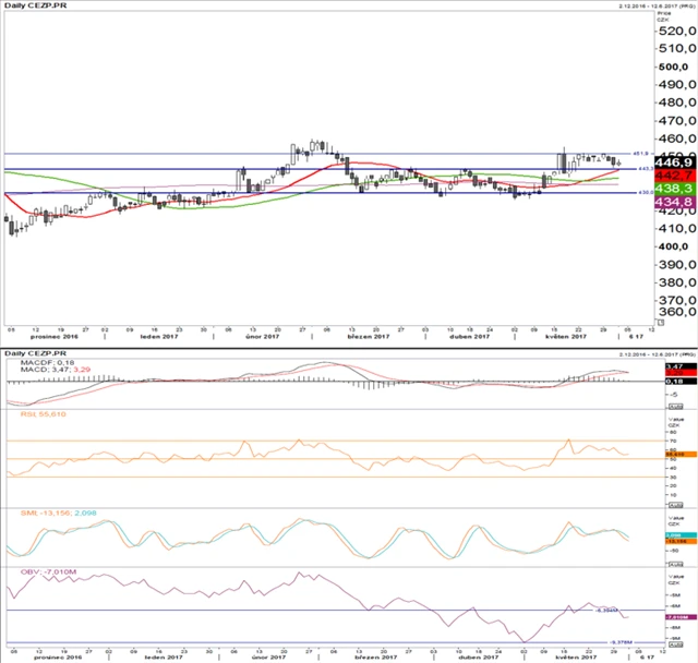 ČEZ, Komerční banka a MONETA Money Bank: České blue chips pohledem technické analýzy (2. 6. 2017)
