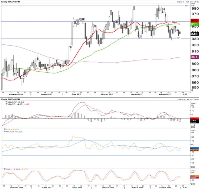 Očekávané zotavení titulu mělo krátkodobý charakter. Cena vystoupala k 950, následně ale klesla k současným 938. Pohled na technické indikátory nenabízí zrovna důvody k optimismu, lépe řečeno indikátory vyznívají neutrálně. MACD se se svou signální linií nekříží a RSI je zhruba uprostřed svého vyhrazeného prostoru, pouze SMI se jeví mírně negativně. Pro příští týden očekáváme pohyb v pásmu 931-957, přičemž by měly převládat spíše tlaky na pokles ceny.