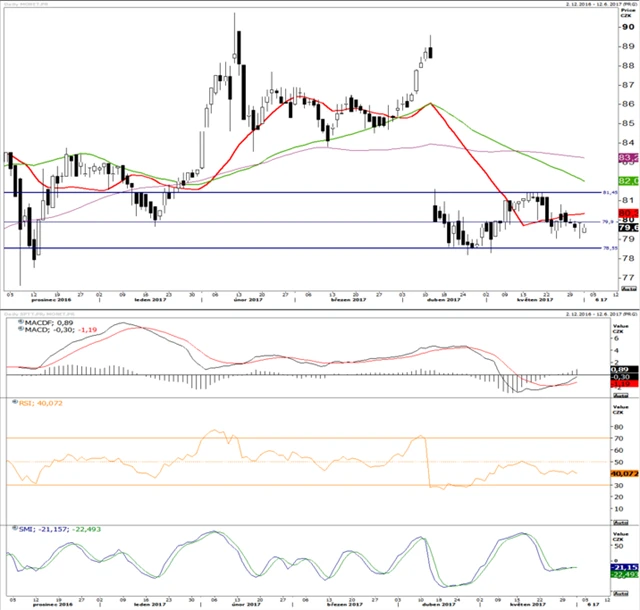 Pásmo 81,45-78,55 se zdá být pro další týden dané. Hospodářské výsledky již banka reportovala, index MSCI nedoznal výrazných změn, a akciím tak chybí impulz pro výraznější pohyb. Podpůrným argumentem pro růst ceny je vývoj MACD, která se v záporném pásmu překřížila se svou signální linií. Zbytek indikátorů je ale nevýrazný, a nic tak podle našeho názoru nenasvědčuje vybočení z cenového pásma. Pro příští týden čekáme pohyb ceny do strany, případně by mohly mírně převládnout nákupní příkazy.