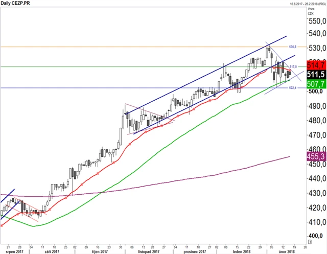 Cena akcií ČEZ zůstává pod hlavním rostoucím cenovým kanálem. V posledních dnech se titul nachází mezi 20- a 50denním průměrem. Vytváří se trojúhelníková formace, která by při proražení mohla vyslat vstupní signál. Nejbližší rezistencí je 20denní průměr, následují linie na úrovni 517 a 530,8. Nejbližším supportem je 50denní průměr, následuje linie podpory na 502.