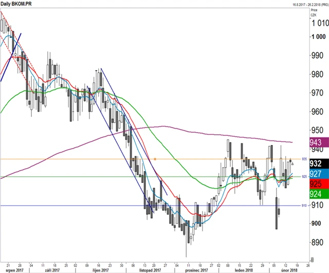 Cena akcií KB se po propadu v minulém týdnu vrátila nad krátkodobé průměry. Ve středu otestovala rezistenci na 935, kterou ovšem nepřekonala. Ve čtvrtek dopoledne kurz lehce rostl a podle nás se pokusí překonat rezistenci na 935. Nejbližší support je na 925, navíc podpořený krátkodobými průměry. Nejbližší rezistence je na 935, následuje 200denní průměr. Signálem k nákupu při konzervativnějším obchodním stylu by mohlo být proražení právě 200denního průměru.