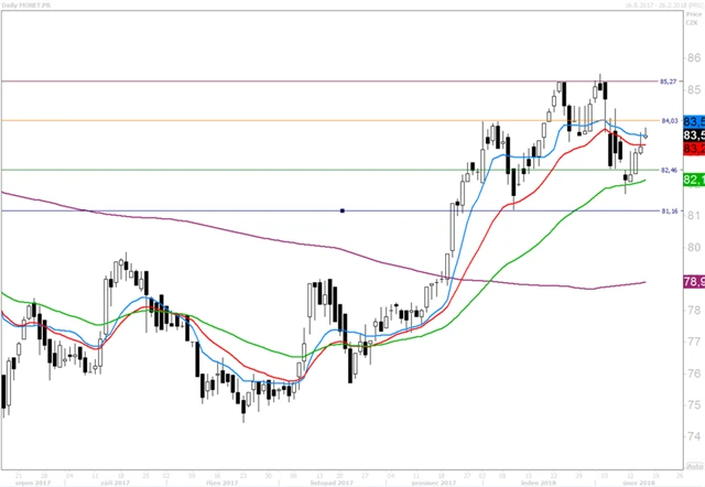 Akcie Monety Money Bank se minulý pátek propadly k 50dennímu průměru, od kterého se vydaly výše. Od začátku týdne se snaží přiblížit ke krátkodobým průměrům. Ve čtvrtek kurz zahájil seanci nad 20denním průměrem, ovšem nadále pod 10denním. Nejbližší support je 83,2, následuje 82,4. Nejbližší rezistencí je 10denní průměr, pak hladina 84. Aktuálně je kurz pod rezistencemi, které mohou bránit dalšímu růstu.