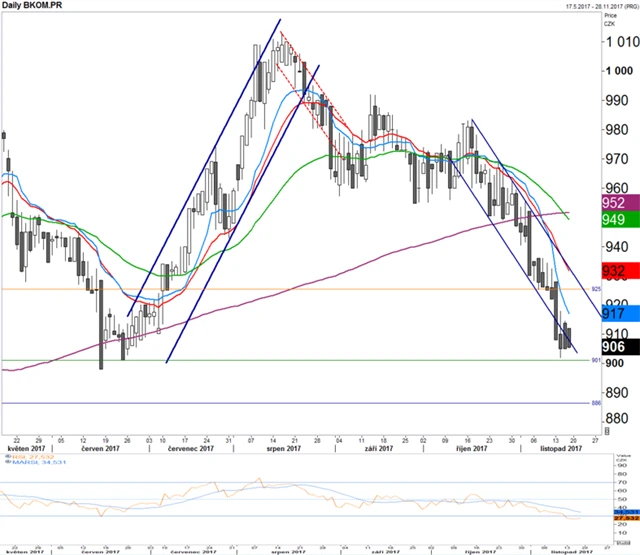 Akcie KB nadále oslabují a nacházejí se pod klouzavými průměry v sestupném cenovém kanálu. Cena sestoupila k supportu na 901. Při jeho proražení lze čekat další pokles k hodnotám okolo 886. RSI se dostal pod 30, což by mohlo značit přeprodanost a tendenci ke korekci výše. Nejbližší rezistence je na 925. Support na 901 napoprvé cenu odrazil, pokud by došlo k proražení, další support je na 886.