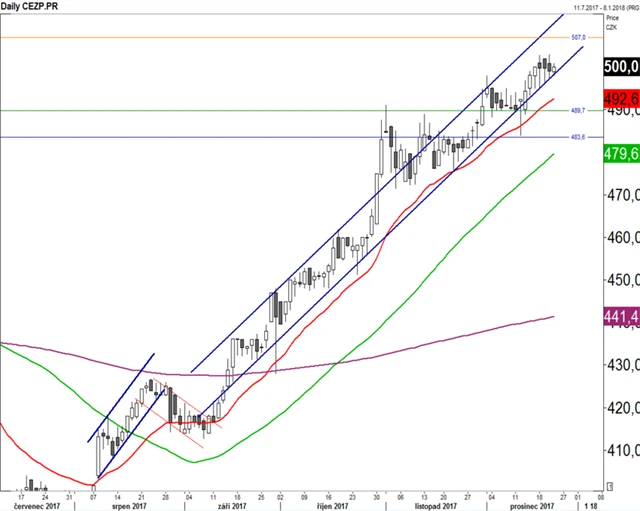 Cena akcií ČEZ nadále roste a překračuje hladinu 500. Růst je v mezích cenového kanálu, několikrát otestoval jeho spodní hranici, ale vždy uzavřel nad ní. Kurz se nachází nad klouzavými průměry. Nejbližší rezistence se nachází na 507, support tvoří spodní hranice cenového kanálu, 20denní průměr a následně support linie na 489.