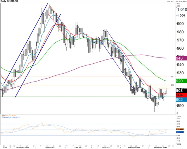Cena akcií KB se po vystoupení z klesajícího cenového kanálu vydala do strany. Titul ve středu uzavřel nad krátkodobými průměry a směřuje výše. RSI je poblíž neutrální úrovně 50, ale vytváří lehkou divergenci s cenovým grafem. Cena se drží nad silným supportem na 901. Nejbližší rezistencí může být předchozí maximum na 911, následuje rezistenční linie na 915, jejíž proražení by mohlo být signálem snahy o obrat trendu.