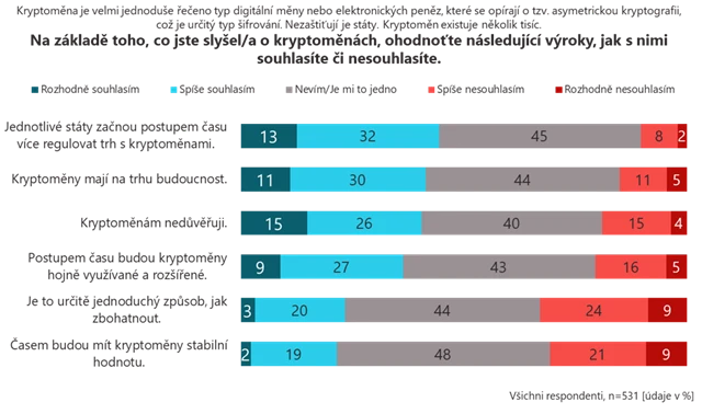 Téměř polovina dotázaných očekává, že státy postupně začnou trh s kryptoměnami více regulovat. Dvě pětiny lidí míní, že kryptoměny mají na trhu budoucnost, ale 41 % jim nedůvěřuje. Zhruba čtvrtina Čechů si myslí, že jde o jednoduchý způsob zbohatnutí.