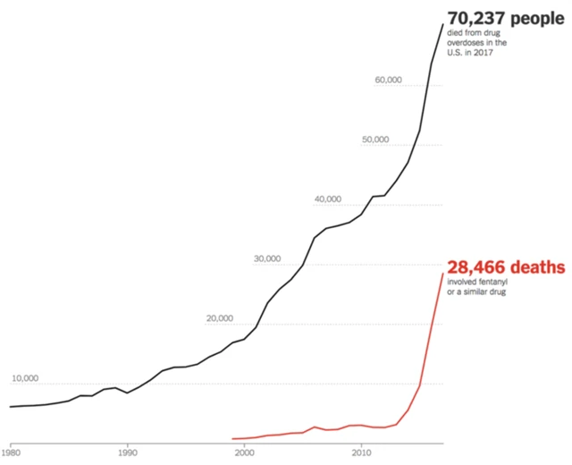 Zatímco v minulosti byl největší hrozbou mezi drogami heroin, v současnosti jej nahradily syntetické drogy, jejichž podíl na úmrtích předávkováním od roku 2013 strmě roste. Aktuálně je počet smrtelných předávkování vyšší než například počet úmrtí na AIDS v době největšího řádění nemoci.