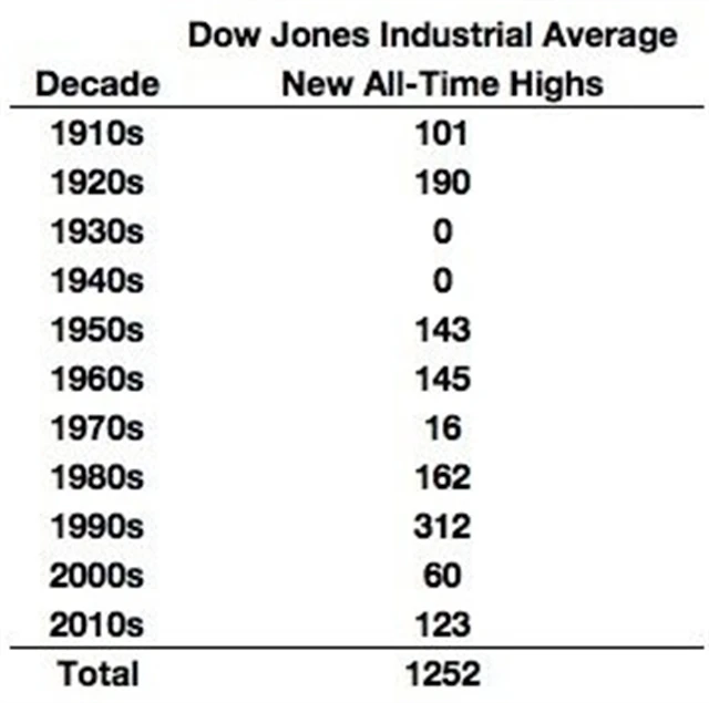 Od roku 1915 do současnosti zaznamenal index Dow 1 265 historických maxim (v tabulce jsou data do konce ledna 2017, proto je součet nižší), což je v průměru 12 ročně. To je zhruba 5 % z celkového počtu obchodních dnů. Za předpokladu dlouhého investičního horizontu kolem 40 let je to téměř 500 historických maxim za kariéru investora, tedy ne málo.