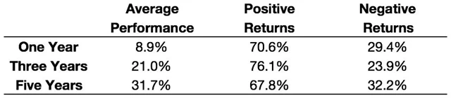 A jak se indexu Dow dařilo po překonání historických maxim v jednoletém, tříletém a pětiletém horizontu?