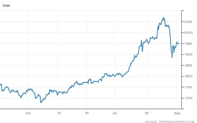 Minulý týden došlo k prudké korekci ceny zlata pod 2000 USD za trojskou unci. Je trh na vrcholu? Obě podstatné hnací síly růstu, tedy nižší reálné sazby a nafukování bilance Fedu, jsou možná u konce s dechem.