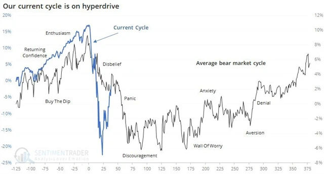Pokud by se mělo dění na trzích dále posouvat tak, jak naznačuje graf, jsou nyní trhy ve fázi, která přichází po panice, tedy malého odhodlání investorů sázet na akcie (discouragement). Zda se ještě ceny akcií sesunou na hlubší dno, není jasné, vysoce pravděpodobné je ale pokračování volatilního vývoje po řadu měsíců, což bude část investorů dále odrazovat od návratu (či prvního vstupu) na trh.