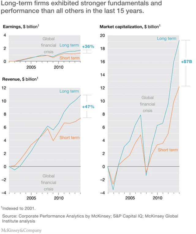 "S každým krátkodobým rozhodnutím se ničí hodnota," říká Mark Wiseman ze společnosti FCLT Global. Mimochodem, zkratka FCLT znamená Focusing Capital on the Long Term. Wiseman si tedy sice přihřívá vlastní polívčičku, data mu ale dávají za pravdu. Americké společnosti, které se soustředí na dlouhodobé cíle, reportovaly podle studie společnosti McKinsey mezi lety 2001 a 2014 v průměru o 47 % vyšší příjmy než ostatní velké a střední firmy. Jejich akcie kromě toho zaznamenaly nižší volatilitu a investorům umožňovaly vyšší výnosy.
