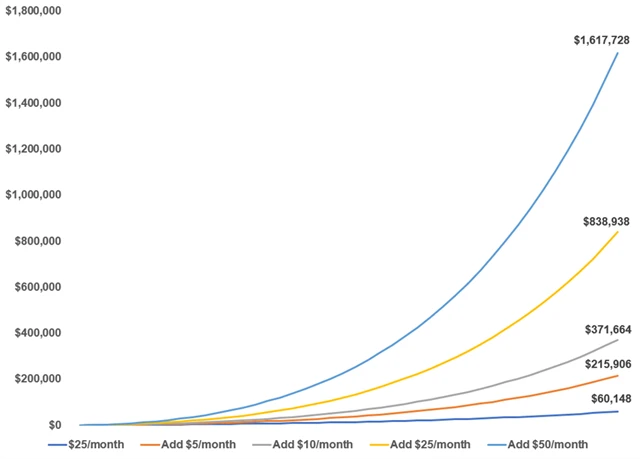 Jako příklad Carlson používá člověka, který začíná s pravidelnou investicí ve výši 25 USD. Kdyby člověk tuto částku investoval každý měsíc od 22 do 65 let a průměrné roční zhodnocení jeho portfolia bylo 6 %, měl by na konci přes 60 000 USD. To není špatné. Kdyby navíc dokázal každý měsíc na obchodní účet posílat ještě o 10 USD více, dělalo by to na konci přes 370 000 USD. A při investování 75 USD měsíčně, což stále není mnoho, by konečná suma byla přes 1,6 milionu USD.