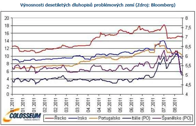 Po oznámení záchranných kroků ze strany eurozóny výnosnosti poklesly. Stále jsou ovšem na velmi vysokých úrovních. V případě Itálie a Španělska, které se nacházejí ve srovnání s výše uvedenými zeměmi v lepší situaci, jsme byli svědky prudkého růstu výnosností především v červenci. Následoval mírný pokles a další růst. A to v situaci, kdy výnosnosti bondů IPR (Irska, Portugalska, Řecka) klesaly. Příčinou byl příslib záchrany těchto zemí ze strany fondu EFSF. Problémem ovšem je, že prostředky do fondu mají poskytnout právě i Španělsko a Itálie (čtvrtá a třetí největší ekonomika eurozóny), které jsou samotné zadlužené. Investoři začali pochybovat o schopnosti těchto zemí svou situaci vyřešit.