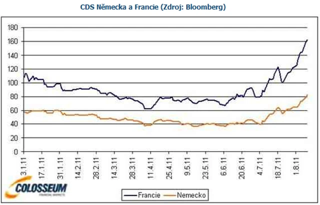 Nervozita na trzích rostla a ECB se rozhodla zasáhnout a nakupovat italské a španělské dluhopisy, což vedlo k prudkému propadu výnosností. Situaci dočasně zachránila. S potížemi Itálie a Španělska se nicméně zvyšuje tlak na Německo a Francii, které by měly financovat většinu záchrany v rámci EFSF. Zcela zřejmé je to na CDS, které znázorňují náklady pojištění proti bankrotu. V posledních týdnech prudce rostou.