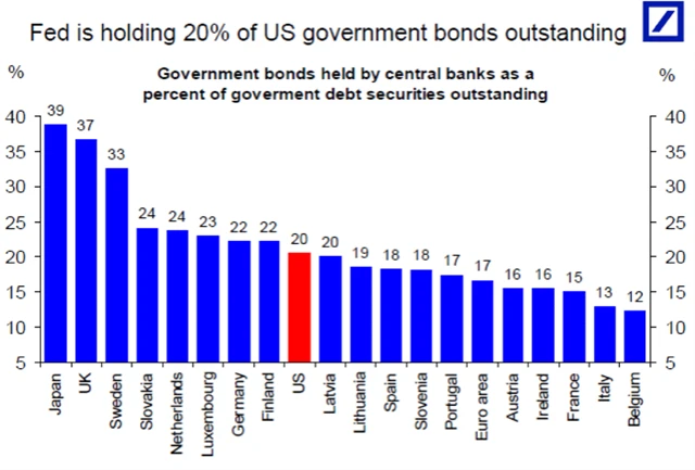 Z globálního hlediska ale není situace v USA až tak hrozivá. Ekonom Torsten Sløk z Deutsche Bank sestavil graf, v němž srovnává objem státních dluhopisů v bilancích centrálních bank v poměru k celkovému objemu vydaných vládních cenných papírů.