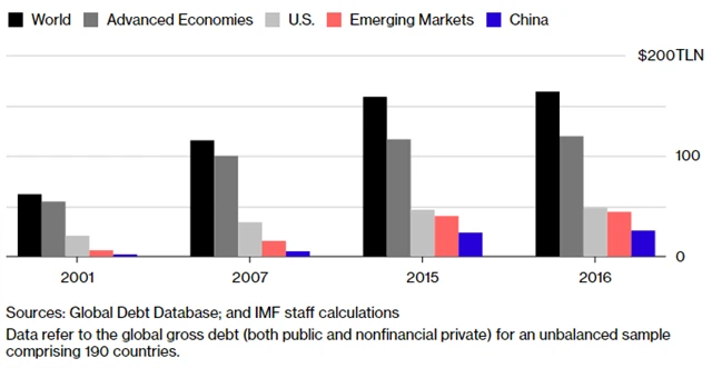 Hodnota světového dluhu se v roce 2016 vyšplhala na rekordních 164 bilionů dolarů, informoval před několika dny Mezinárodní měnový fond. Hodnota dluhu v poměru ke globálnímu HDP je aktuálně 225 %. Prudce roste jak objem veřejného, tak soukromého dluhu. "Jde o velice vysoká čísla, která by svět měl vnímat jako varování," říká ekonom z MMF Vítor Gaspar.