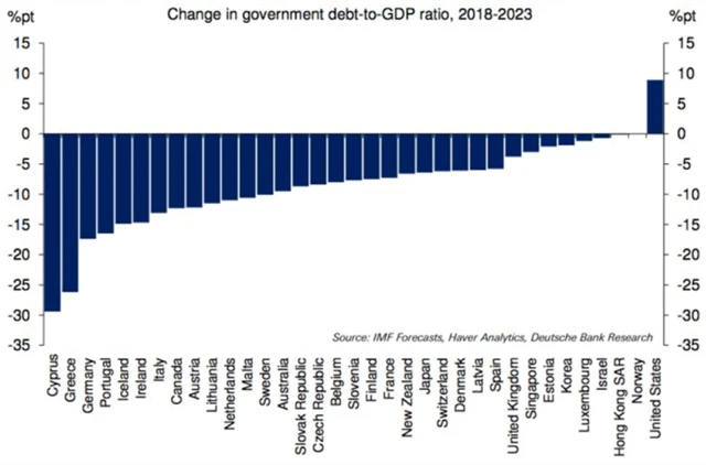 Vývoj zadlužení ve Spojených státech amerických a fiskální situace obecně se v posledních pěti letech až tak nelišily od ostatních zemí G20. Ale podle Quinna Brodyho a Torstena Sløka z Deutsche Bank se to může rychle změnit. "Daňová reforma nás přiměla zhoršit fiskální výhled pro USA," napsali stratégové kvůli kombinaci omezení příjmů rozpočtu a plánovaných větších výdajů. Americký rozpočtový deficit v důsledku toho v dalších deseti letech výrazně naroste.