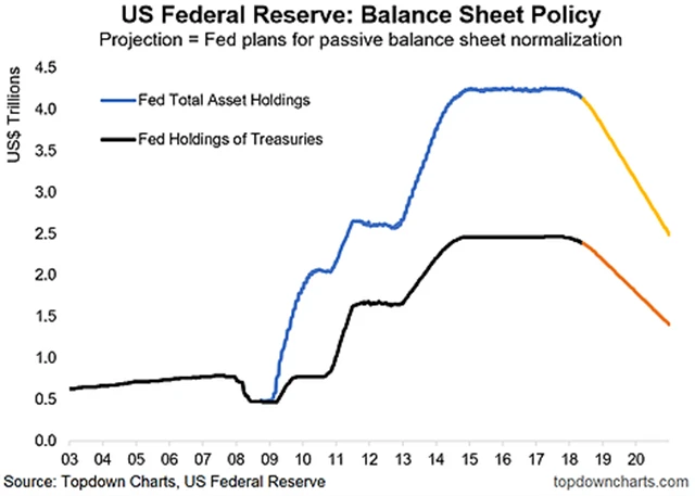 Poprvé sice Fed zvedl sazby již na konci roku 2015, ale až koncem roku 2016 se do zvedání úroků pustil odvážněji. Kromě normalizace sazeb se také musí zbavit velkého množství nakoupených finančních aktiv, která jeho rozvahu nafoukla do nevídaných rozměrů.