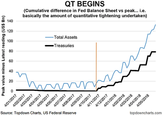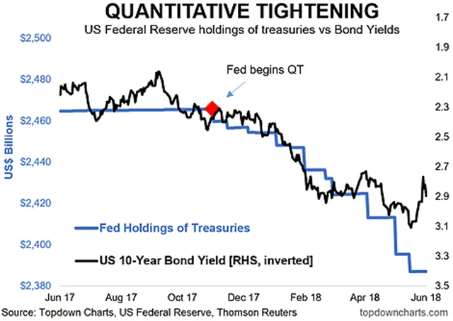 Zahájení QT se celkem shoduje se začátkem poměrně značného pohybu výnosů desetiletých dluhopisů USA. Existuje samozřejmě mnoho jiných faktorů, které hrají roli v růstu úroků z obligací (inflace, hospodářský růst), ale obecně platí, že menší objemy nákupů a zmenšování rozvahy znamenají menší počet dluhopisů stažených z trhu a držených centrální bankou. To vede k růstu jejich výnosů.