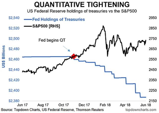 Názory investorů a ekonomů na rozsah vlivu kvantitativního uvolňování (QE) se různí, všeobecně se ale tvrdí, že pomohlo akciovému trhu. QT by naopak mohlo akciím uškodit. Pokud nedojde k jiným změnám, zrychlování QT akciím určitě nepomůže.
