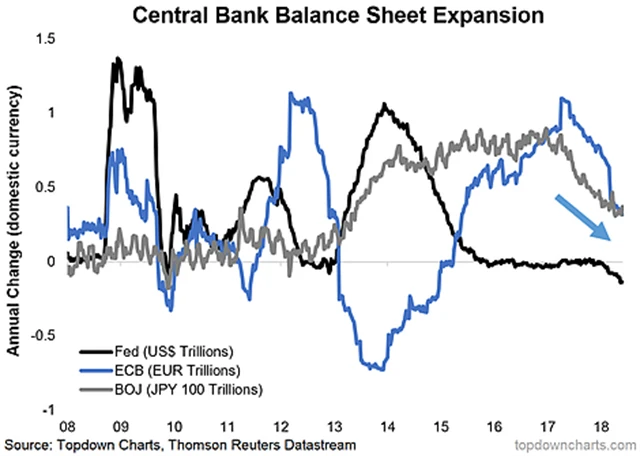 Fed není jediný, kdo v posledních letech přišel s experimentem označovaným zkratkou QE, ale momentálně je jedinou velkou centrální bankou, která přistoupila k redukci své rozvahy. Japonská i evropská centrální banka v uvolněné politice zatím pokračují, ale i u nich je patrné zpomalování tempa nákupů finančních aktiv. Lze říci, že sice zatím zmírňují dopady politiky Fedu na finanční trhy, ale nemusí to trvat dlouho.
