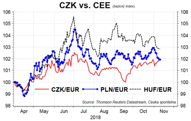 Riziko prosincového posunu úroků ovlivní ještě jeden faktor spojený s českou korunou, a sice to, jak na globální faktory reaguje koruna ve srovnání s regionálními kolegyněmi. ČNB si donedávna mohla říkat, že ačkoli koruna na její zvyšování sazeb nereaguje posílením, tak alespoň v reakci na globální faktory nejméně oslabuje. Jinými slovy, mohla uvažovat tak, že kdyby nezvyšovala sazby, byla by koruna podobně slabá jako forint nebo zlotý. Nicméně tyto měny začaly v posledních dnech posilovat, zatímco koruna dále slábla. Čímž se jistota, že to "ČNB přece jen má pod palcem", začíná poněkud hroutit.