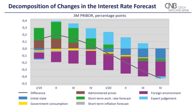 Nová prognóza předpokládá, že by ČNB měla zvýšit základní sazbu na 2 % v první polovině letošního roku. Ve druhé by ji ale měla snížit zpět na 1,75 % a tam ji ponechat do konce roku 2020. ČNB tedy nečeká, že by bankovní rada v dohledné době pokračovala v normalizaci úroků a přibližovala úroveň sazeb k rovnovážné úrovni, kterou banka odhaduje někde okolo 3 %.