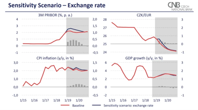 Tím se dostáváme k takzvaným citlivostním scénářům. První ukazuje, co by se stalo, kdyby koruna v první polovině letošního roku neposilovala a zůstala v blízkosti 25,6 EUR/CZK. ČNB by sazby zvýšila v letošním roce až na 2,5 %, tedy hodně, a teprve pak by se úroky postupně vracely k původní trajektorii. ČNB tedy naznačuje, že přechodně slabší koruna o čtyřicet haléřů přinutí bankovní radu zvýšit sazby o dalších padesát bodů.