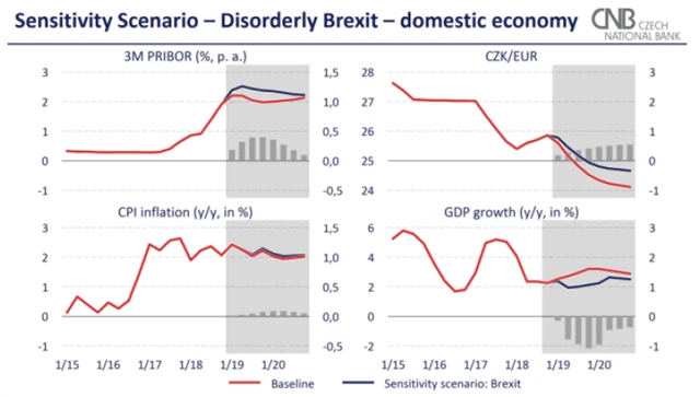 Druhý citlivostní scénář ukazuje, co by se stalo s českou ekonomikou v případě tvrdého brexitu. Růst HDP by zpomalil ke 2 %. Ale protože by koruna byla slabší o zhruba čtyřicet haléřů na konci tohoto roku (24,9 EUR/CZK) a zhruba o padesátník na konci roku příštího (24,6 EUR/CZK), tak by ČNB na tvrdý brexit reagovala zvýšením sazeb až na 2,5 %. To není příliš intuitivní. Možná je problém v tom, že banka v tomto scénáři očekává vyšší výrobní inflaci v eurozóně a vyšší sazby ECB než ve scénáři základním.
