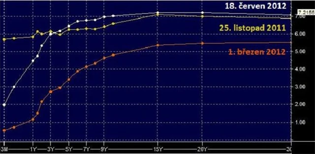 V poslední době se však situace rapidně zhoršuje, což dokazuje i pohled na výnosovou křivku ze začátku tohoto týdne. Nejenže je delší konec výše, než kde se pohyboval koncem listopadu, ale i kratší konec zaznamenal proti březnu výrazný posun vzhůru. Za 12měsíční dluhopisy Španělsko musí nabízet úrok 4,5 %, za relativně výhodných podmínek si může půjčovat pouze na velmi krátkou dobu. Země se tak pomalu dostává do podobně složité situace jako loni v listopadu a je pouze otázkou času, kdy bude potřebovat další pomoc.