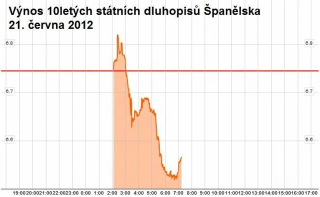 Španělsko si ve čtvrtek půjčovalo na 2 až 5 let. Výnosy požadované investory oproti květnové aukci výrazně vzrostly, Španělé ovšem nakonec upsali více, než původně plánovali (2,2 miliardy eur, čekaly se jen 2 miliardy).