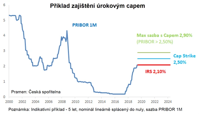 Příklad: Na 5 let lineárně splácený úvěr zajištěný od sazby (strike) 2,50 % stojí průběžně placených 0,40 % p.a. jako přirážka k sazbě PRIBOR. Nejvyšší možná sazba je tudíž 2,90 % (2,50 + 0,40). Klesne-li naopak PRIBOR například na 1,50 %, celkový náklad bude 1,90 %, což je méně než sazba IRS.