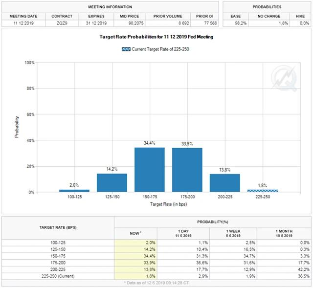 Podle údajů burzovní skupiny CME trh věří, že Fed sazby sníží již příští měsíc, základní úroková sazba podle trhu klesne ze současného pásma 2,25-2,50 % do pásma 2,00-2,25 %. Na konci letošního roku podle trhu bude základní úroková sazba s největší pravděpodobností buď v pásmu 1,75-2,00 %, nebo v pásmu 1,50-1,75 %.