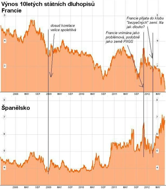 Francie pod vedením prezidenta Hollanda sice musí hledat úspory v rozpočtu, ten však myslí spíše na vysoké daně pro bohaté než na snižování platů státních zaměstnanců nebo důchodů. Její dluhopisy ovšem v posledních měsících posilují. Španělsko naproti tomu oznamuje škrty v desítkách miliard eur, ale investoři ho stále tlačí do kouta zvaného "neúnosně vysoké úroky za půjčky". Proč?