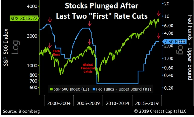 Všeobecné očekávání je takové, že první snížení sazeb ze strany centrální banky je pro akcie příznivé. Když se na trhu neděje nic zvláštního, je uvolňování měnové politiky pro trhy skutečně pozitivní. Pokud se ale podíváme na dva poslední případy prvního snížení sazeb ze strany Fedu, optimismus bere zasvé. Snížení sazeb v letech 2000 a 2007 nebyla pro akcie žádnou spásou.