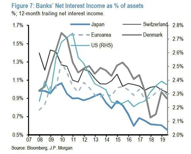 Čistý úrokový výnos jako relativně k velikosti aktiv od začátku roku 2015 klesá u dánských i švýcarských bank (od zavedení negativních sazeb po roce 2015) a také v Japonsku od roku 2016. V eurozóně pomohl druhý program aukcí úvěrů od ECB (TLTRO II) snížit náklady na financování, ale rozdíl mezi zeměmi s negativními sazbami a například USA je poměrně velký. Právě v Americe došlo u bank ke zlepšení čistých úrokových marží z minima v roce 2016 díky růstu sazeb centrální banky.